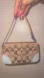 Elegant Coach wristlet with signature pattern. Features light blue accents and a convenient strap.