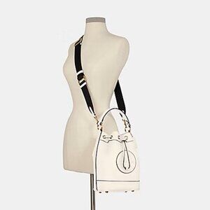 Refined pebble leather. Inside zip pocket. Drawstring closure, fabric lining. Detachable strap with 25" drop for shoulder or crossbody wear. Four protective feet at base.