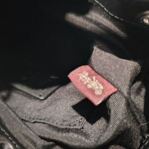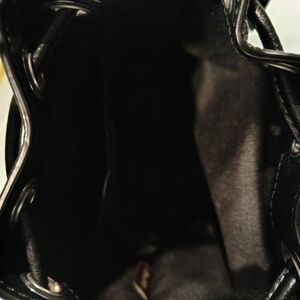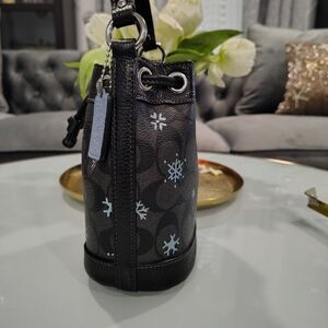 Coach Dempsey snowflake mini leather bucket bag. Authentic! (See. Brown label inside bag and coach engraved in tiny feet asking with perfect stitching) New without tags, in excellent condition no blemishes, 6" wide, 7 inches tall, with small strap makes it 11" tall. Pebble black leather with blue snowflakes and tag. Cute perfect little bag to hold your phone, keys and makeup when you want to travel light!