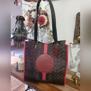 The Coach Dempsey Tote Bag 22 in black leather with pink exterior and black canvas handles is a stylish and versatile handbag for women. The bag features a classic tote style with black leather lining and hardware, providing a sophisticated and timeless look. The combination of luxury leather and durable canvas ensures both durability and elegance, making it a perfect accessory for any outfit or occasion. Perfect for carrying everyday essentials in style.