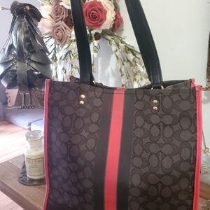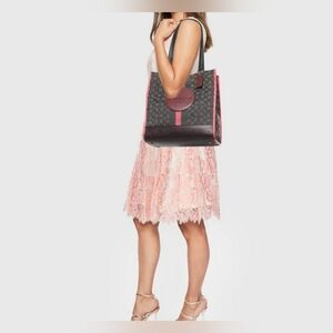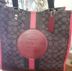 Coach Dempsey Tote Bag 22 in black leather with pink exterior and black canvas