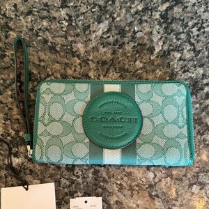 Elegant Coach wristlet in aqua. Features iconic logo pattern and wrist strap.