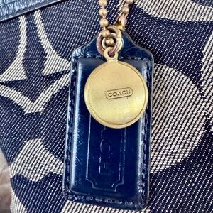 Coach Denim Medium Signature Shoulder Tote, Zippered, in Navy color, with gold hardware and with two tags - one round metal and a leather one. In excellent condition.