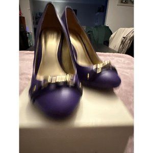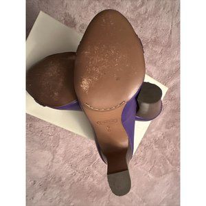 Elevate your shoe game with these ultra high block heels from Coach. The slip-on pumps feature a closed toe design with a bold purple hue, perfect for adding a pop of color to any outfit. The hook buckle metal accent adds a touch of edginess to the overall sleek and sophisticated look.