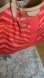 • Bold red/coral zebra jacquard with taupe leather trim