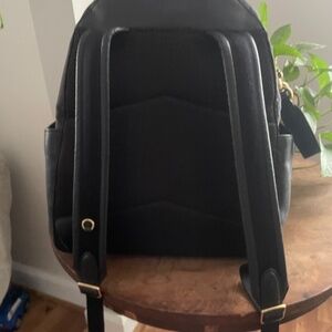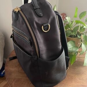 • Large Diaper Backpack bag • Adjustable shoulder straps • Outside open pocket,Outside zip pocket • Inside zip pocket • Inside multifunction pocket • Zip-top closure • Nylon and polished pebble leather • Fabric lining • Gold-tone hardware • Color: black • SIZE: Length: 13.5" x Height: 13.5" x Width: 5.5" • DROP: Top handle with 2" drop • Style No. 99290