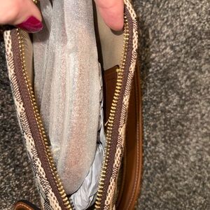 Stylish handbag featuring Disney characters. Brown and tan design with playful accents.