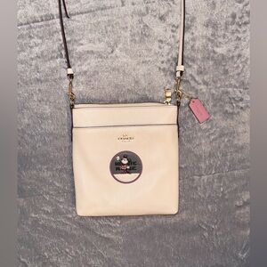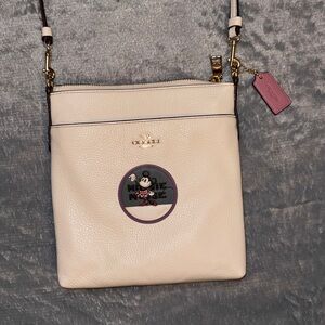 Chic Coach cream leather crossbody bag. Features Disney patch. Elegant gold hardware. Minnie Mouse