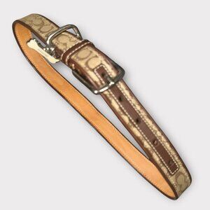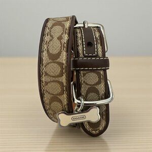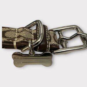 A stylishly crafted Coach dog collar in extra-large size, featuring a signature khaki canvas design with brown leather accents. The collar includes a durable buckle closure and an elegant bone charm, ensuring a touch of class for your pet's wardrobe.