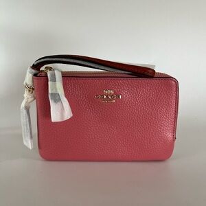 Elegant and stylish, this Coach wristlet in pink leather is perfect for any occasion. Its compact design and premium quality make it a must-have accessory.