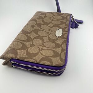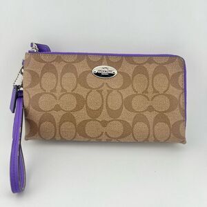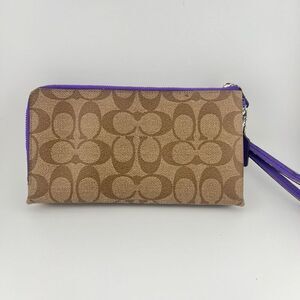 Coach Double Zip Wallet In Signature F16109 Khaki/ Purple Wristlet