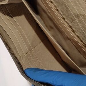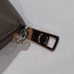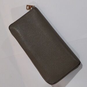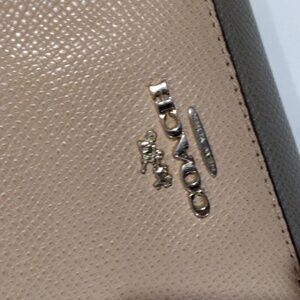 This Coach color block gray and tan leather long wallet features a round zipper design, bill slots, credit card slots, and a coin zipper pocket with gold hardware. In good condition, this stylish and functional wallet is perfect for keeping your essentials organized. Please refer to the pictures for detailed conditions.