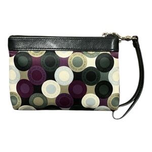 This Coach wristlet combines playful polka dots in black and purple with a sophisticated black leather trim. Compact and stylish, it's perfect for carrying your essentials with ease. Removable strap with silver tone hardware. The interior is gorgeous plum color with a backside slip pocket. In excellent like new condition. Includes Hang Tag.