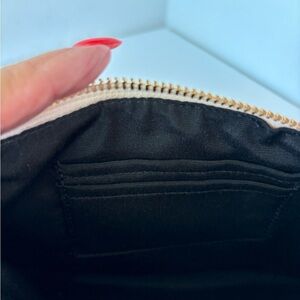 compartment has a large slip pocket. Adjustable leather shoulder strap 26” drop can be shortened to your liking. Used once the cream colored has small light smudging on the sides from the leather strap. Not very noticeable.