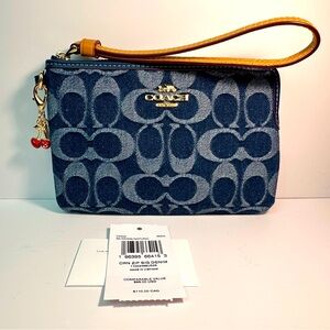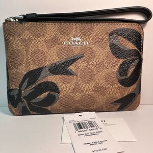 Features: Dark Red Brick Red Tan and Black Monogram C Signature Print Coated Canvas Designer Y2K Classic Casual On The Go Holiday Valentines Day Sweetest Day Christmas Pretty Silver Tone Hardware has Coach Etched on it Zipper is YKK 2 Inner Slip Pockets Designer Corner Zip Wristlet