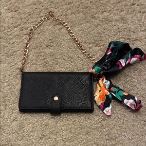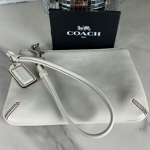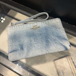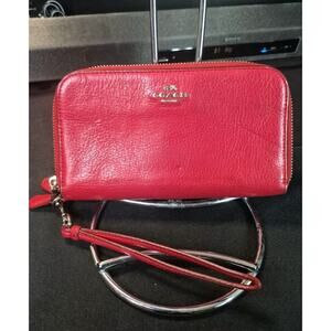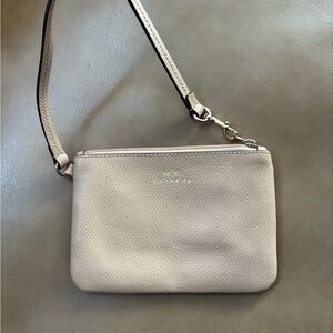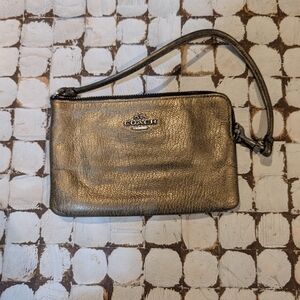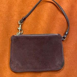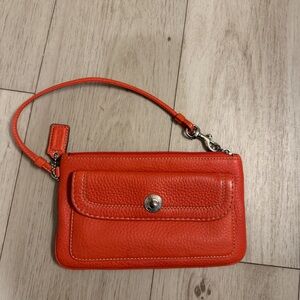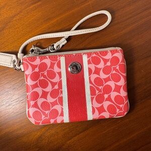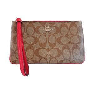 Excellent Used Condition: Wristlet has a tiny spot of red color transfer on front right near bottom and back right near bottom. I’ve circled these as they are very light and I didn’t even see them until I was in super bright light. There is a tiny dark spot on zipper and the gold tone is starting to coming off of the zipper pull. The inside has a small stain. This is all visible in photos and video.