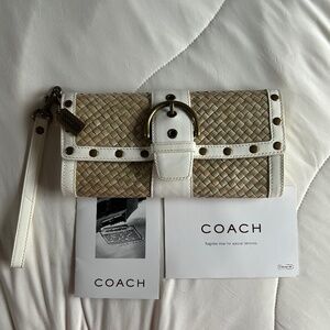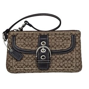 Features: Khaki and Tan Rainbow Radial Print Signature C Horse and Buggy Pride Casual Classic Trendy On The Go Daytime Fun Colorful Cute Designer Gold Tone Hardware Inside has 2 Slip Pockets Small Corner Zip Wristlet