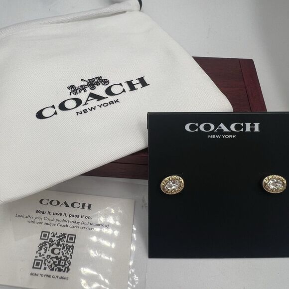 Coach Earrings Women's Oval Rhinestone Swarovski Crystal Stud Gold Tone New Gift