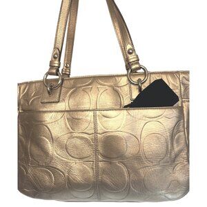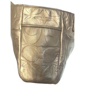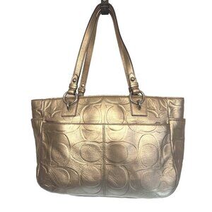 Coach East West Embossed Signature Gold Metallic Shoulder Bag Tote Purse authent