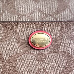 Coach East West Swingpack Khaki Brown Coated Canvas & Persimmon Patent Leather. The exterior of the bag is made of coated canvas in Coach's signature C pattern and is trimmed with persimmon colored patent leather. Persimmon is a bright pink with tones of orange. Gold-tone hardware. She has a full-width slip pocket on the front and a top-zip closure with leather zipper pull. The interior is tan canvas with 1 slip pocket. The crossbody strap is adjustable in length.