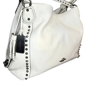 This sophisticated Coach Edie 31 shoulder bag is crafted from soft chalk pebbled leather and accented with edgy silver and gold-tone rivets. Its slouchy silhouette and triple-compartment interior make it both stylish and functional for everyday use.