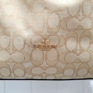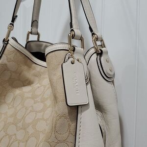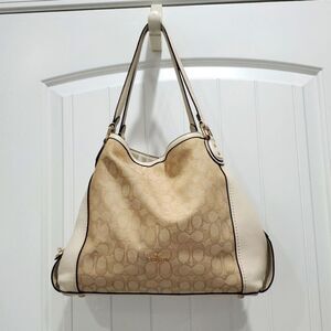 This elegant shoulder bag showcases a light beige hue with a subtle textured pattern, enhancing its sophisticated appeal. The slouchy hobo design offers a spacious interior, while the darker trim adds a refined touch. Ideal for daily use, this bag combines style and practicality effortlessly.Coach Edie 31 Leather & Siganture Jacquard Print Shoulder Bag, EXCELLENT CONDIT