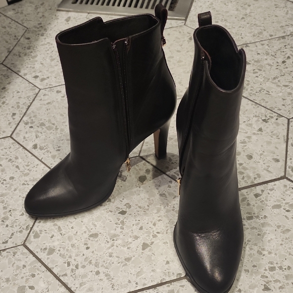 Sophisticated brown leather boots by Coach. Features a sleek silhouette and high heel. Perfect for stylish occasions.
