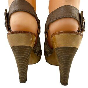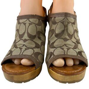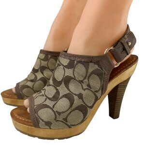 Coach Elena Mule Slingback Peep Toe Brown Khaki Canvas Monogram Size 7/38