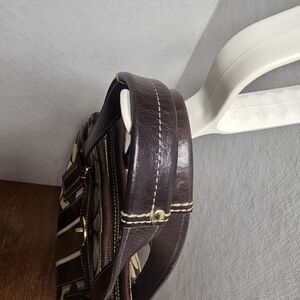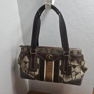 Coach Embossed Canvas Signature Striped Medium Carryall Handbag, Style #11620 turn lock on front and zipper on top.