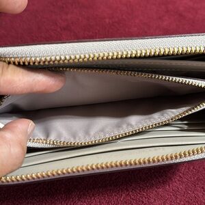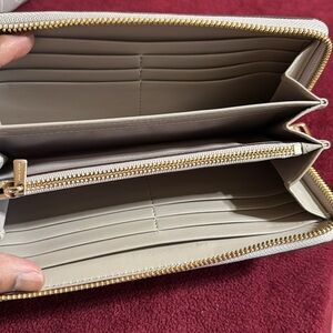 Beautiful Embossed Crocodile accordion zip wallet in grey birch. Inside coin zip. Divider near coin pouch for receipts or other paper items. 6 credit card slots on each side and 2 bill holders, also.😊
