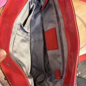 Coach Embossed Red Patent Leather Tote Bag C embossed, east-west design. Style F17728. Pockets on both ends and on the back panel. Interior zipper pocket, slip pocket and cell phone pocket with closure zipper at top. Excellent condition, no cracking.