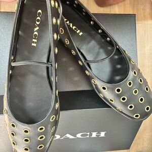 Made of black leather, this Mary Jane style features a cute grommets detail, giving it a trendy and unique look. With a comfortable fit and a classic black color, these shoes are perfect for everyday wear or special occasions. The Coach brand is known for its quality and craftsmanship, making these Mary Jane's a must-have for any fashion-forward woman's wardrobe.