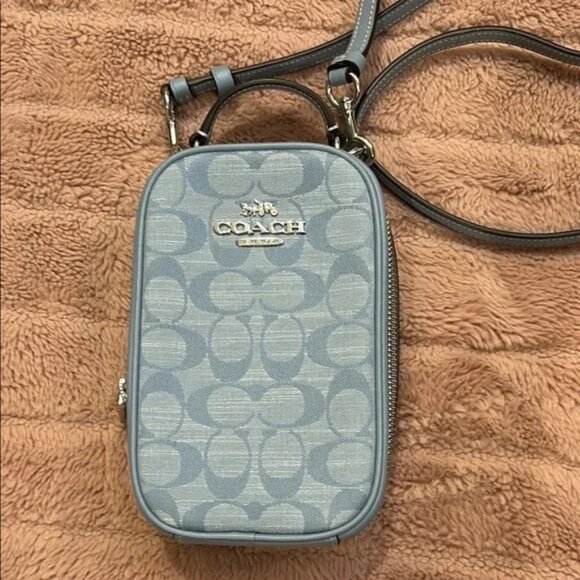 Chic, compact, and versatile — this genuine Coach Eva Phone Crossbody keeps your essentials close in timeless signature style. Crafted in signature coated canvas with smooth light blue leather trim, it features gleaming silver hardware, a top handle, and a detachable crossbody strap for hands-free convenience. The structured silhouette holds your phone, cards, and small must-haves with effortless polish.