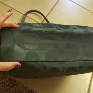 COACH Laura Tote extra pics. Please notice the mark through the gray C which was there when I purchased. Also in looking closely there is fingernail length scratch near the bottom front. Last pic is of bottom of purse pretty clean but can tell it's been sat down and not perfectly new as would be from store. These things r not visible when purse is in normal position. Otherwise super great condition...inside is excellent condition!!! Ready to use upon arrival!!! Thanks for looking!!!