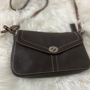 Elegant dark brown leather crossbody by Coach. Features adjustable strap and secure closure.