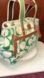 Coach F11995 vintage monogram, green white canvas/brown leather trim like new
