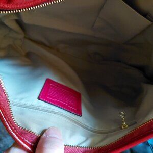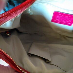 Coach Large Patent Leather Hobo Tote Bag is in like new condition. Bag includes a Dust Cloth for protection and has the Coach Tag. The interior has the Coach Creed, Inner Pockets, Key Clip, and is clean with no stains or signs of wear. The outside of the bag is free from scratches and marks. The strap has a drop of 10 inches and is not adjustable. Closure is a Zipper Top, and Turnlock on the front pocket. The hardware is gold color. This bag is retired and is water resistant. The bag is not heavy, and is surprisingly lightweight for a Tote, making it easy to carry. The bag can hold a lot of items, and the structure of the bag allows for comfort as the strap is built in making it stable and can easily carry the weight without any damage to the bag, strap or your shoulder. Beautiful Brick Red color.
