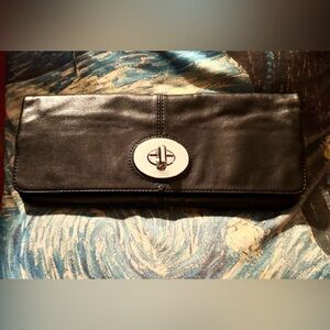 Coach Madeline fold over clutch in black leather released in 2008. Features a stylish pink signature sateen interior and a large silver-tone turn lock closure. One large compartment overall, and a zip pocket under the flap. Perfect for any occasion, dress up or down. Made of extremely soft leather and in great condition. Only minor issue is the turn lock metal shows some wear.