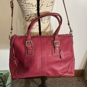 Elegant and timeless Coach Legacy satchel crafted from full-grain leather in a rich magenta (raspberry pink) color. Features dual top handles, a detachable crossbody strap, brass-tone hardware, and a spacious interior with zip and slip pockets.