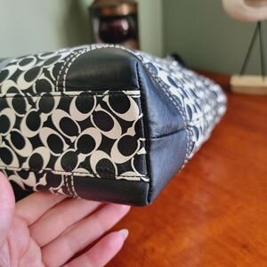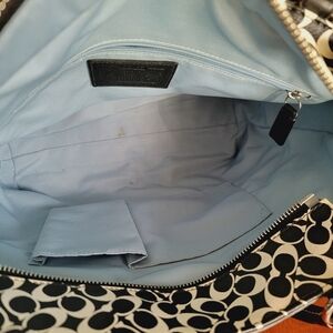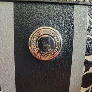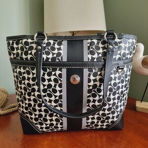 Coach Chelsea Heritage Stripe Signature Black White Coated Canvas Tote Bag is Coach style number F15137, made in 2010. The exterior of the bag is made of coated canvas in Coach's signature C pattern in a striking black and white combo. The handles, trim, corners, and other accents are made of black leather. Silver-tone hardware. Front slip pocket and a d-ring to clip on keys, bag charms or other accessories. Rear slip pocket. Top-zip closure with leather zipper pull, and the zipper is designed to separate fully for ease of entry into the bag. The interior is light blue canvas and has 2 slip pockets and 1 zipper pocket with leather zipper pull.