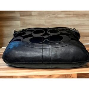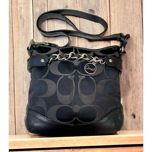 This F19730 Signature Chain Crossbody Bag in black/brown from 2012, is the perfect crossbody bag for everyday use! Featuring a Signature motif in dark brown on a black background with silver chain detail and black leather trim, this bag is a perfect example of iconic Coach style and function. With its adjustable strap, this bag can be worn as a crossbody or as a shoulder bag and has enough room inside for all your needs. If you are a Coach fan, you need this in your collection!