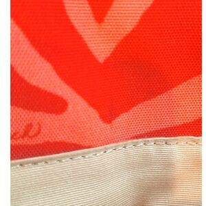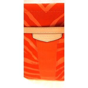 This Coach F23283 Zebra Print Canvas Tote bag features zebra print in hot orange with tan leather trim and straps.
