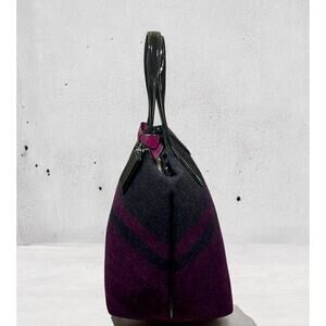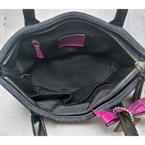 This Coach F24786 Signature Stripe Wool Tote Bag from 2013 is just adorable! Featuring striped wool in the Passion Berry/Dark Gray colorway with black patent leather handles/trim and an adorable bow, this little bag is perfect for the colder months and when you want to travel light. If you love and appreciate Coach styles and quality, you need this super cute bag in your collection!