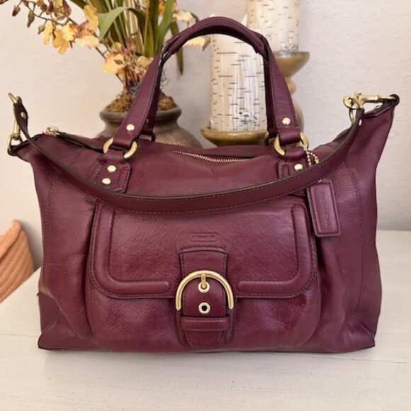 COACH #F25151 "Campbell" Large Satchel in Bordeaux Leather with Brass Accents is in very good vintage condition, and includes a detachable shoulder strap, large outside pocket with magnetic enclosure; inside pocket sections, inside zipper compartment and fully zips for extra security; see approximate dimensions in photos. CIRCA 2013-selling on Coach Re-loved for over $400!!