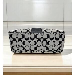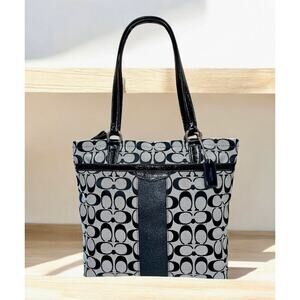 This Coach F28504 Signature Stripe Tote Bag and Snap Wallet from 2014 is such a classic Coach look and style! Featuring grey/black Signature Jacquard, black patent leather straps/trim and a black stripe, this set is the perfect size when you want a smaller tote option that still has plenty of storage space. If you love Coach quality and design, this is a must have for your collection!