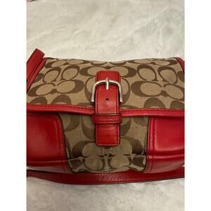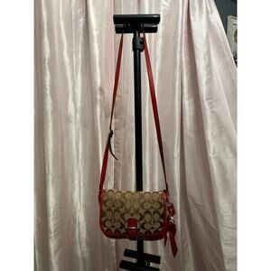 Tags: Coach F30601, Coach crossbody, Coach red leather trim, signature jacquard Coach, classic Coach turnlock, vintage Coach style, authentic Coach purse, everyday Coach bag