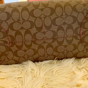 Coach F36658 Tote Bag with signature print and orange trim. Both pieces are in excellent condition however it does have an ink spot on the bottom on the inside. I only used it to carry my paperwork in the original tag is actually still on the signature pouch. The original cost was $350. Please review pictures for all information and condition. Perfect color for fall.