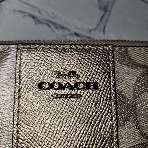 Coach gold metallic leather wristlet. Interior has two credit card pockets. Gold leather wrist straps. Signature c design with gold leather stripe. measures 6" X 4". F38655