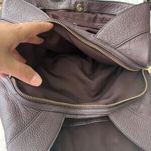 This Coach F57545 leather shoulder bag features supple, high-quality pebbled leather in a deep chocolate brown tone with signature gold carriage logo and sturdy dual handles. The interior is clean, organized, and ready for use — perfect for everyday wear or as a timeless vintage accent piece.