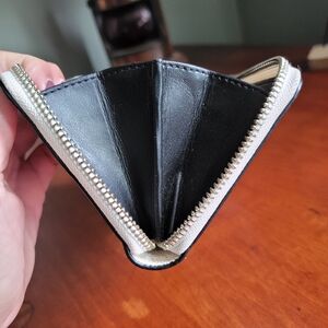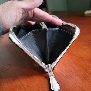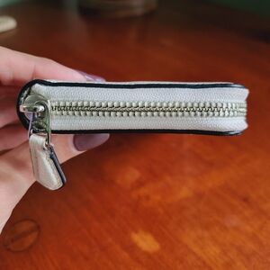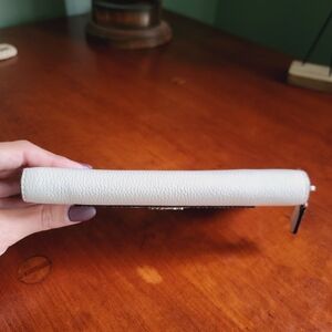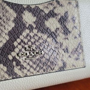 Coach White Pebbled & Snakeskin Embossed Leather Accordion Zip Wallet is style number F57590, made in 2016. The exterior is made of white pebbled leather, with tan and brown python embossed leather accents. Three quarter zipper closure with gusseted sides and leather zipper pull. Silver-tone hardware. Interior has 2 gusseted compartments and a full-width center zipper pocket. Has room for 12 cards, and has 2 slip pockets-- one behind each 6-card slot. Slip pocket on the front of the wallet.
